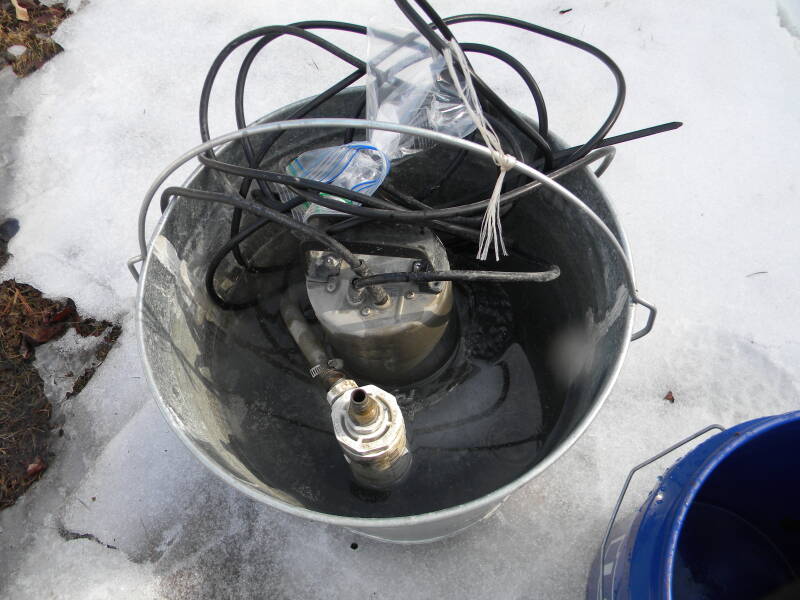 Those big blocks of ice are heavier than they look, and besides, there is a whole bunch of glass bead media in the bottoms of them frozen to the bottom of the ice block that I did not want to lose, so I took a big bucket of hot water and filled them up with that to expedite the thawing process. They're coming along; hopefully I'll be able to pound out or otherwise flatten the bottom of the pump bucket that the ice pushed out and not have any leaks, but I'm not holding my breath.