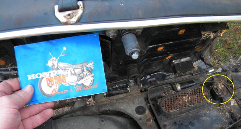 I flipped over the seat to check out the air filter, wiring and tool tray and found this...! There's a little what I call a 'glove box' on these bikes under the seat, and if you get lucky you can sometimes find stuff like this - the original owner's manual and fuse holder, that part circled in yellow, there...both are extremely rare to find!