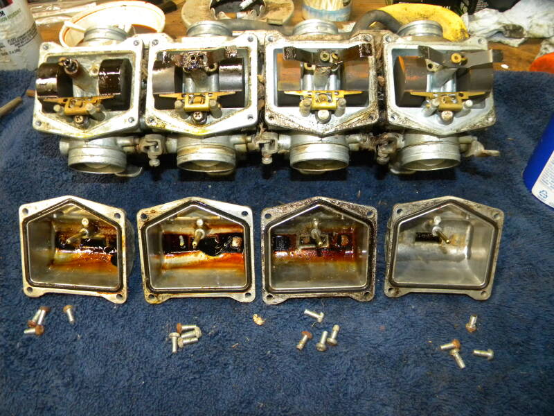 I did my thing - cleaned the carbs, stripped and repainted the frame, side covers and tank...the carbs needed some work, obviously - all that dark stuff in the bowls is dried 'lacquer', or whatever you call that stuff that is dried and baked on, especially on the floats. This was a big PITA to get off/remove...