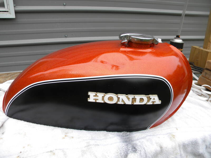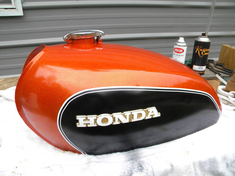 FWIW, I used a gray basecoat, masked off the tank and painted the black areas, then masked that off and laid down a can of Rustoleum Glitter, then topped that off with a can of Kustom Canz Candy Orange. I think it came out pretty well!