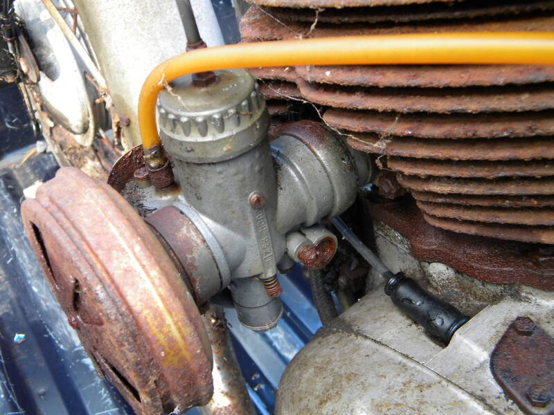 This pic was taken during triage of the bike, where I see what's what and what needs to be fixed, so please excuse the rusty carb fuel metering screws. (Actually, I think the above pic is from the parts bike I had...) but here's a pic of the runner...I left the paint and everything untouched because I rather liked the patina.