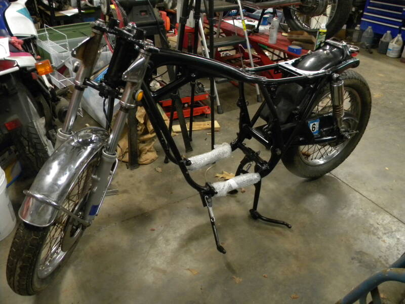 Last fall I had stripped the bike down to the frame and gotten it painted, so it had plenty of time to sit up over the winter and cure. So far I’ve gotten the wheels back on in preparation for getting the engine back in the frame, as you can see here: