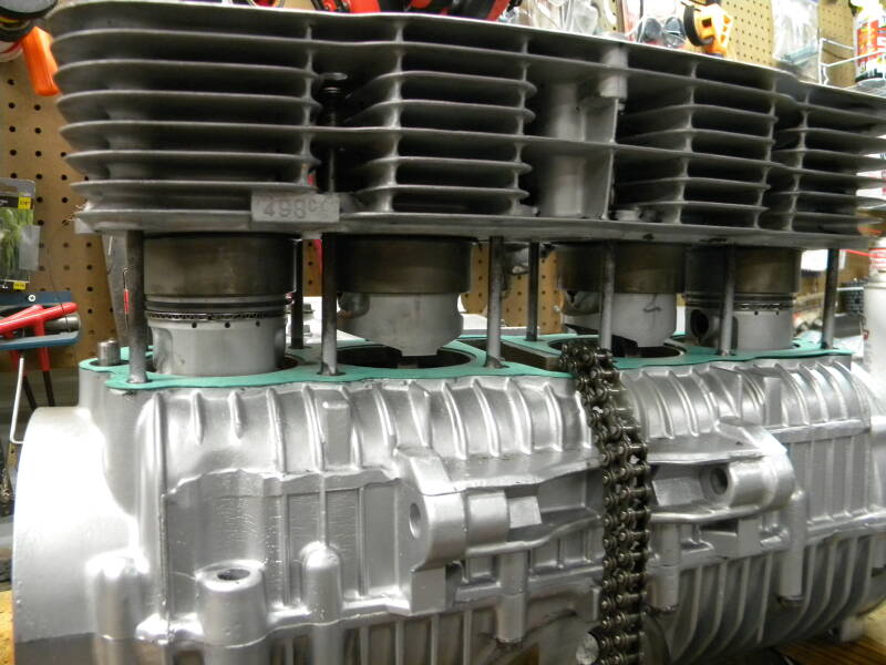 Next up I fitted the cylinder head onto the case. The tricky part is getting all the new rings to slide up into the cylinders. You can see here I started with the two center ones first, which I’ve learned is the way to go. Once you get those two in you have to gently finesse the ones on the end, being careful not to bend any of the delicate oil rings that have a tendency to stick out a bit. Ask me how I know.