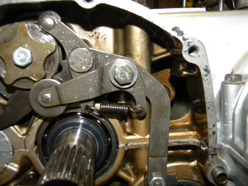 When I was taking all the shifter stuff off the right-hand side here, I discovered that I had neglected to put the shifter armature screw back in correctly - see that big hex bolt above the spring there...? The one with the big scrape on it...?