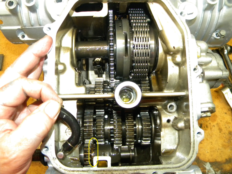 This view is looking UP into the bottom of the engine (it's on the bench upside down) before I undid everything and split the cases, and it was as I feared - you can see the kick start mechanism (circled in yellow there) is meshed with the larger sliding gear on the right. When the kick starter is operating normally, that gear should be separate from the driven gear seen on the left!
