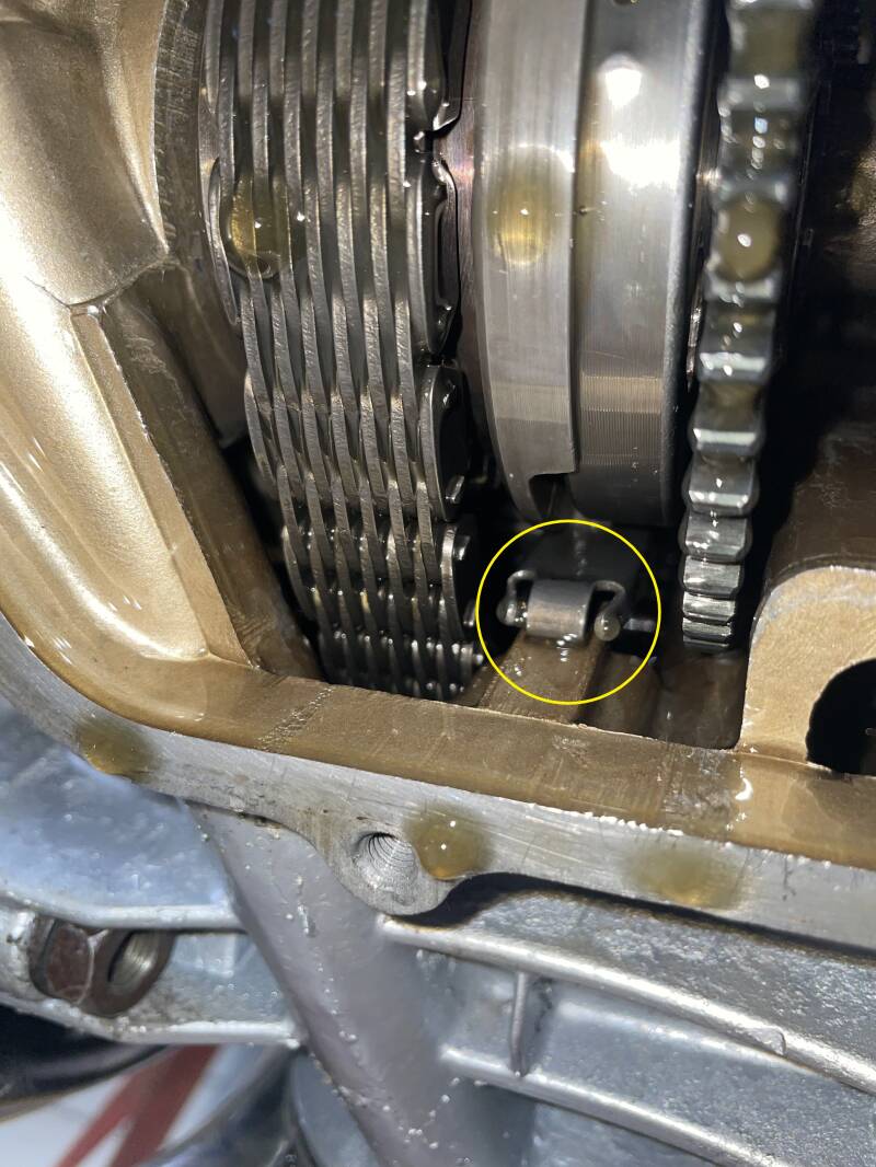 This view is looking UP through the bottom of the engine towards the front – that circle is the end of the misplaced tensioner, which should be sitting in that flat part behind it; you can see the freshly replaced starter clutch above it.