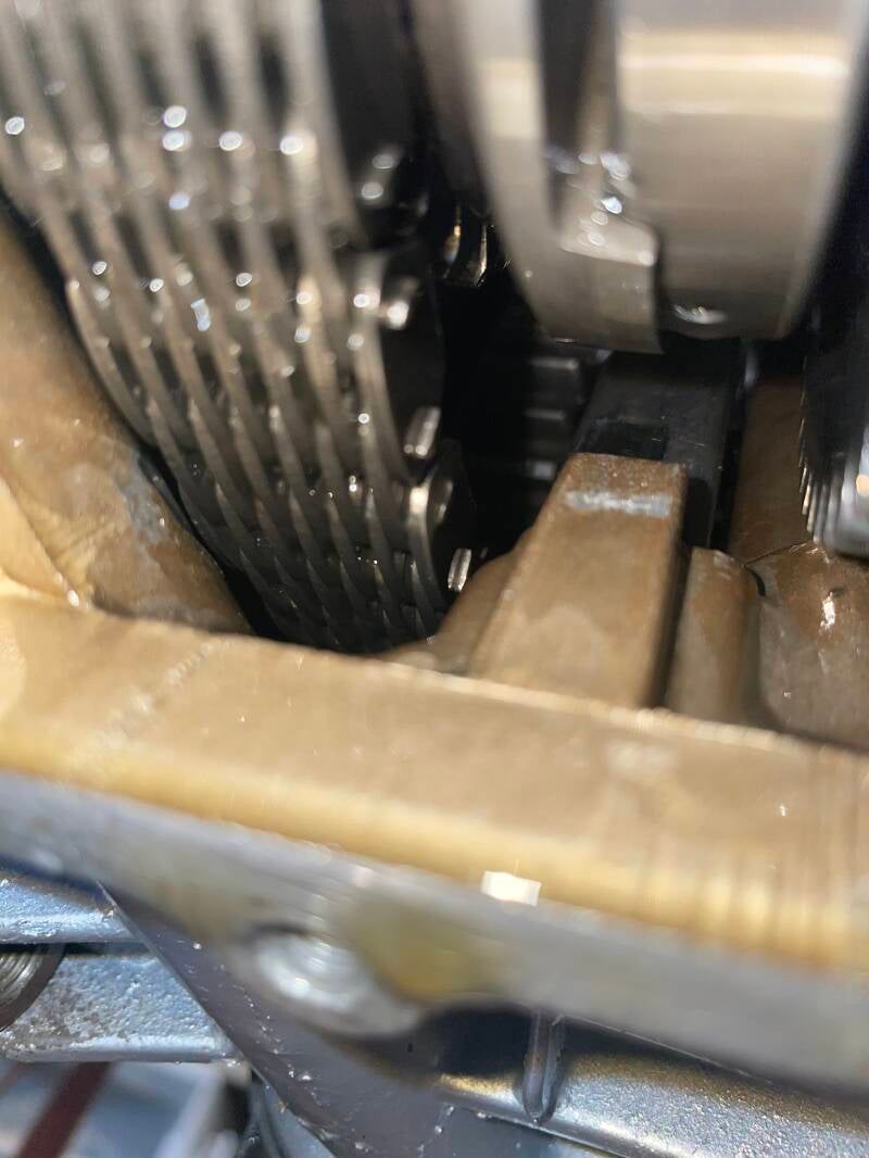 There is a little ratcheting gear in the tensioner that allows you to adjust it from the outside via a little screw, but that gear doesn’t spin to produce that noise...I think it has something to do with the kick starter assembly, which drives a gear that starts the engine when you kick-start it, but of course I could be wrong. Something with the clutch basket, maybe…? At this point I’m open to suggestions-but obviously, mistakes were made. The garage gods are laughing hysterically at me…