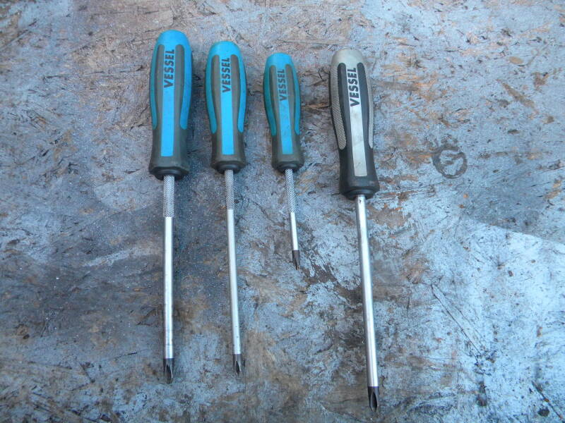 If you're going to be working on old Japanese motorcycles, these are a MUST to have; Japanese motorcycles use what are known as JIS screws, or 'Japanese Industrial Standard'; they are NOT regular philips heads, and using a non-JIS screwdriver on them will chew them up and make them even harder to remove. I only use my Vessels on JIS screws, no other. That last silver-looking one is called an 'Impacta', supposedly a JIS impact screwdriver; it works, kinda...maybe I'm just not hitting it hard enough. A set of these Vessels will run you about $55 on Amazon, but there are other brands of JIS screwdrivers; just make sure they are designated 'JIS.'
