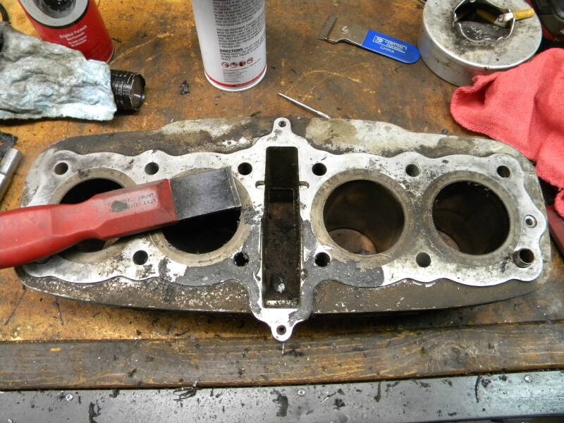 Anyway - The square, flat carbide edges of these things are super hard and can gouge aluminum surfaces if you go all 'gorilla' on them, but if you're careful to make sure the scraping surface is flat on the aluminum they do a great job! I was trying to find a picture of the results, the best I could find was this close-up of some valve seats, which look kind of gross (they cleaned up nice in my vapor blaster) but you can see the clean surface of the head itself; the brown areas are just discoloration.